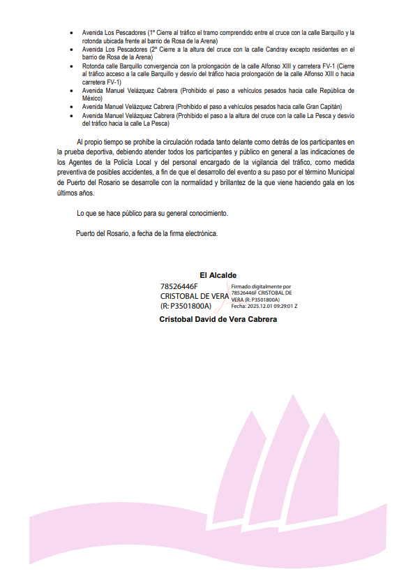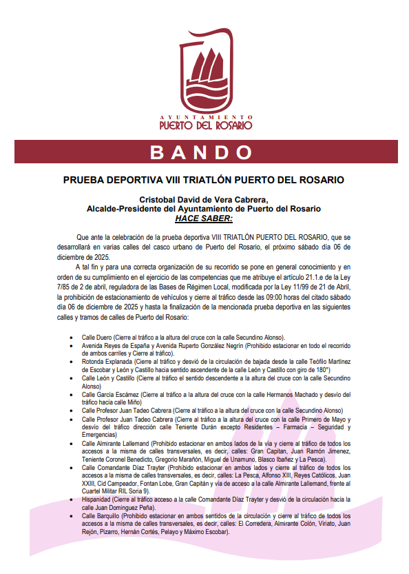 Con motivo de la PRUEBA DEPORTIVA VIII TRIATLÓN PUERTO DEL ROSARIO, que se desarrollará en varias calles del casco urbano, este sábado 06 de diciembre de 2025, nuestros servicios de transporte urbano de las líneas 2, 3 y 3S se verán afectados, desde las 9:00H hasta las 14:00H (hora aproximada de finalización del evento).