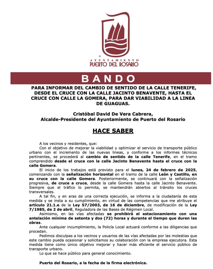 Queridos pasajeros. Les informamos, que el Ayuntamiento de Puerto del Rosario, con el objetivo de mejorar la viabilidad y optimizar el servicio de transporte público, procederá al cambio de sentido de la calle Tenerife en el tramo comprendido entre la calle Jacinto Benavente y la calle La Gomera.